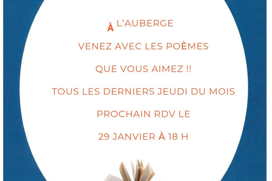 Les soirées poétiques de l’auberge Espalionne Un lieu et un temps pour savourer les mots, les rimes et les idées. Les rencontres poétiques de l’auberge auront lieu les derniers jeudis du mois et voudraient être un moment fort de partage… Lire la suite »Soirée Poésie 🕊