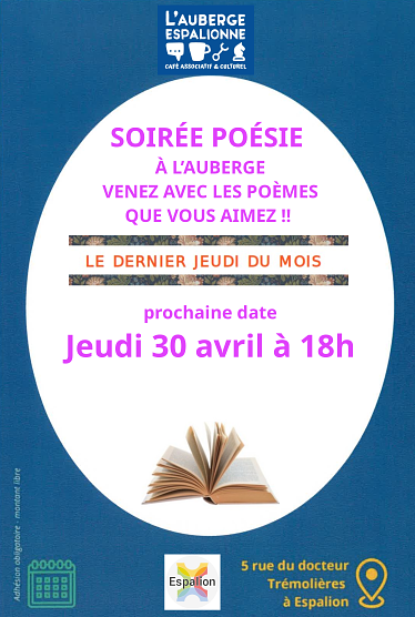 Une soirée pour écouter des mots, en dire si l’envie vient, boire un verre et passer un bon moment ensemble. Le dernier jeudi du mois : 30 avril de 18h à 19h30 Gratuit Adhésion annuelle à L’auberge Espalionne obligatoire (montant… Lire la suite »SOIRÉE POÉSIE – 30 AVRIL