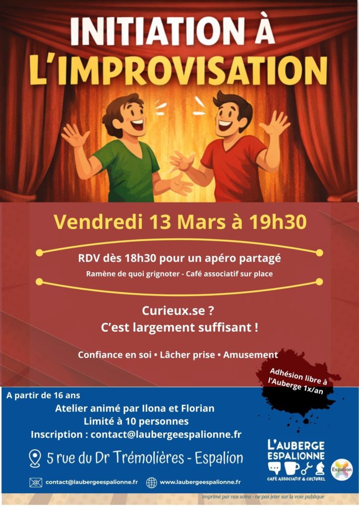 L’atelier sera animé par @Florian et moi, tous deux pratiquants d’impro depuis plusieurs années, avec l’envie de transmettre et de ramener un peu d’impro (pour les adultes !) dans le Nord Aveyron.