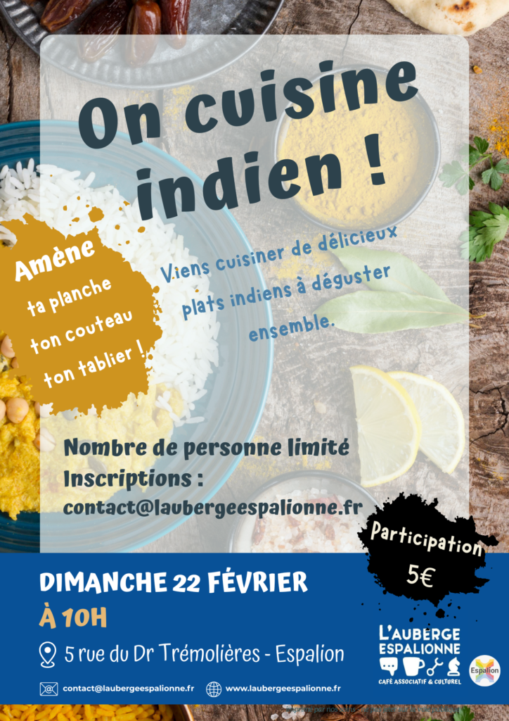 En février, on cuisine indien à l’Auberge espalionne ! Venez apprendre à cuisiner de délicieux plats indiens qui seront dégustés sur place tous ensemble. Pour ce premier atelier, nous ferons un plat unique et végétarien en commençant par la base : bien cuisiner les épices 😍