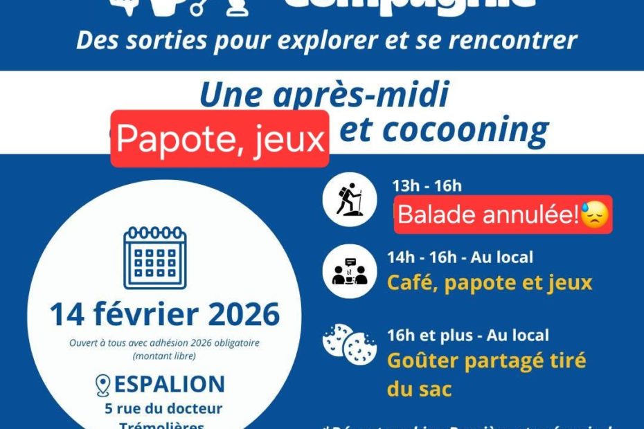 ⚠️ Vu la météo annoncée sur l’Aubrac demain, nous choisissons la sécurité et annulons la sortie à la Cascade du Déroc… ⚠️ Le rendez-vous mensuel de Sortir et Compagnie est maintenu! 🤩🥰 ☕ À partir de 14h, café papote et… Lire la suite »GOÛTER – 14 FÉVRIER –